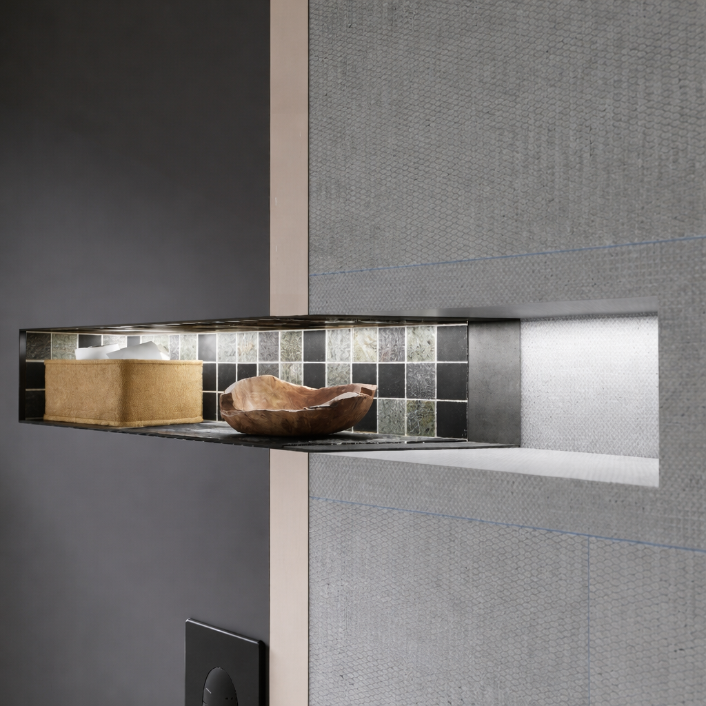 They integrate with Marmox board systems and waterproofing accessories to deliver recessed shelving and storage areas in showers, wet rooms, laundries, and bathroom walls, finished with tiles of your choice for a clean, custom look.